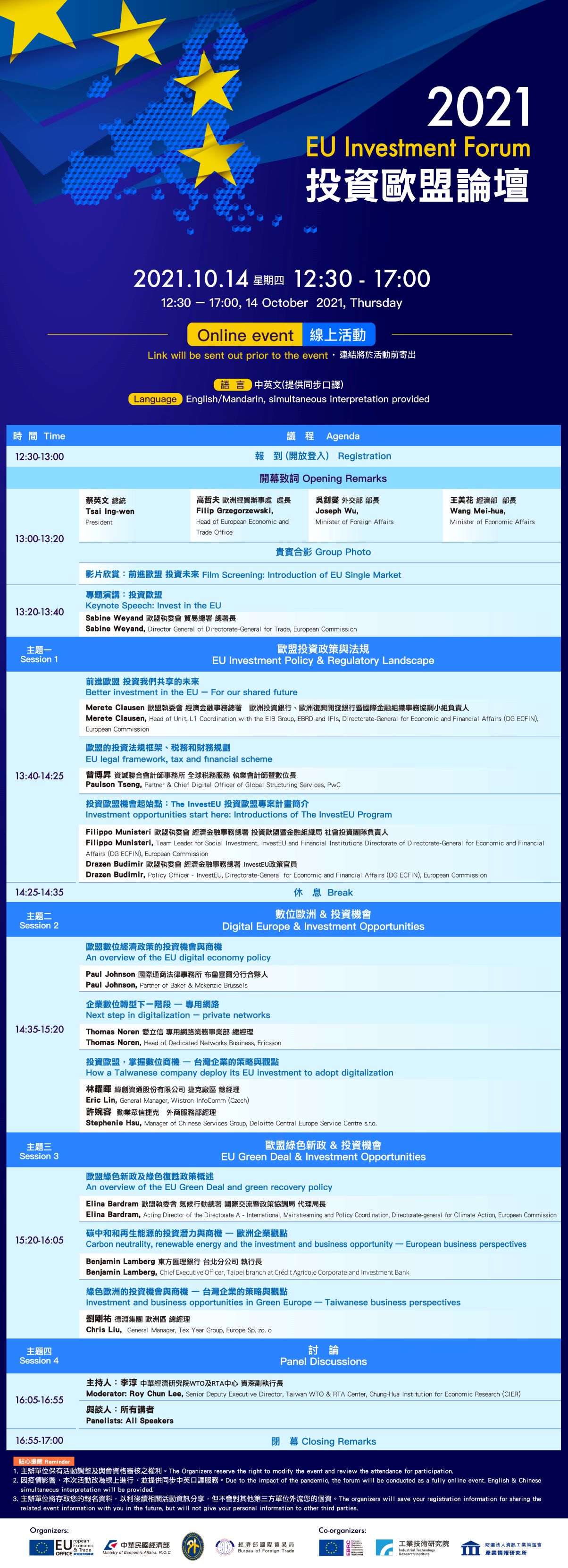 本次論壇邀請歐盟執委會官員說明未來十年歐盟重點產業發展和投資領域,此外,也邀請來自資誠會計師事務所、愛立信、國際通商法律事務所、東方匯理銀行及台灣企業講師,從政策、稅務和投資優惠等角