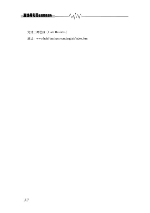 海地工商名錄(Haiti Business) 網址:www.haiti-business.com/anglais/index.htm 32