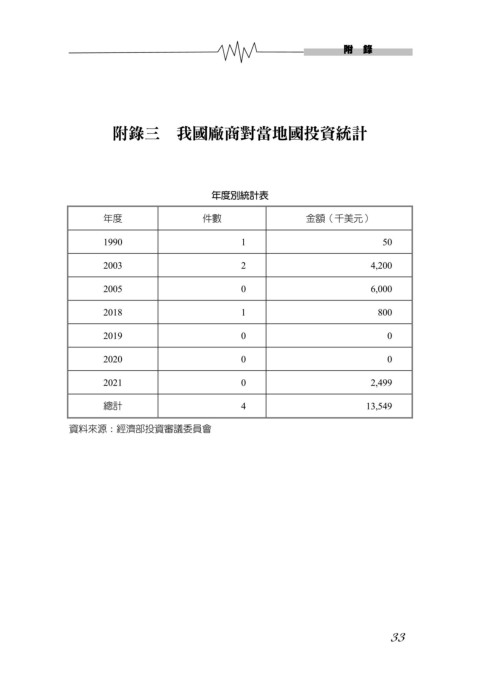 附 錄 附錄三 我國廠商對當地國投資統計 年度別統計表 年度 件數 金額(千美元) 1990 1 50 2003 2 4,200 2005 0 6,000 2018 1 800 2019 0 0 2020 0 0 2021 0 2,499 總計 4 13,549 資料來源:經濟部投資審議委員會 33