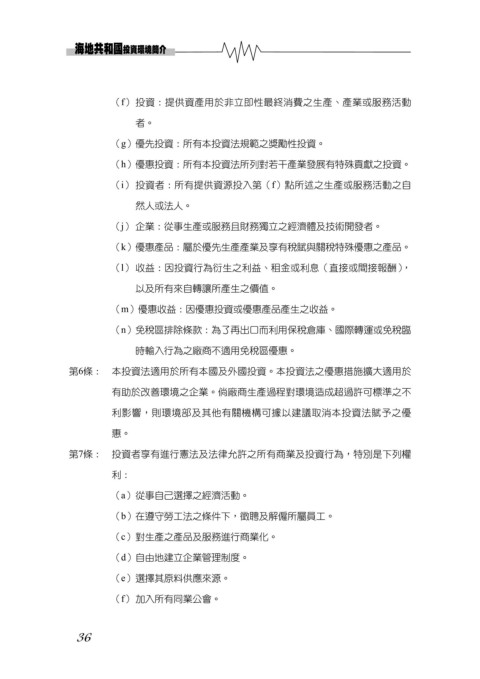 第7條: 投資者享有進行憲法及法律允許之所有商業及投資行為,特別是下列權