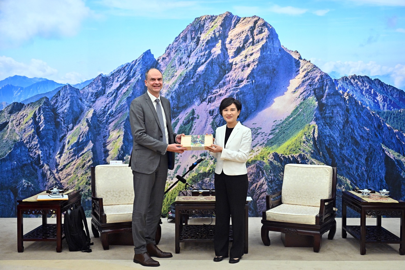 Vice Premier Cheng Li-chiun on Wednesday received Deputy Director-General Hubert Gambs of the European Commission's Directorate-General for Internal Market, Industry, Entrepreneurship and SMEs (DG GROW). The vice premier said that Taiwan-EU relations continue to deepen and expressed hope that, building on this existing foundation, both sides can work together to address future challenges in areas such as green and clean technologies, the circular economy, the establishment of democratic supply chains and the development of artificial intelligence (AI). She also thanked EU member states for their investments in Taiwan's offshore wind power and other renewable energy industries in recent years, and anticipates that these efforts will help Taiwan achieve its goal of sourcing 30% of its power from green energy by 2030.