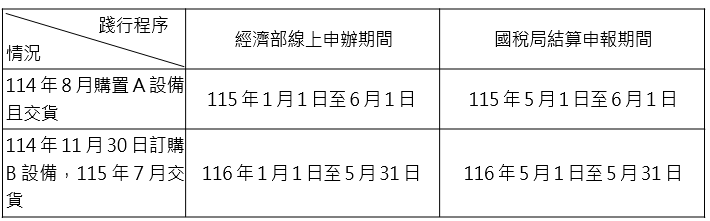該局舉例說明,甲公司會計年度為曆年制,分別於114年8月訂購符合人工智慧之A設備15億元且交貨、同年11月30日訂購符合節能減碳之B設備20億元,預付訂金1,000萬元,預訂於115年7月交貨,甲公司應於何時向經濟部完成線上申辦作業及向國稅局辦理結算申報,始能適用該項租稅優惠呢?相關申辦期間如表列: